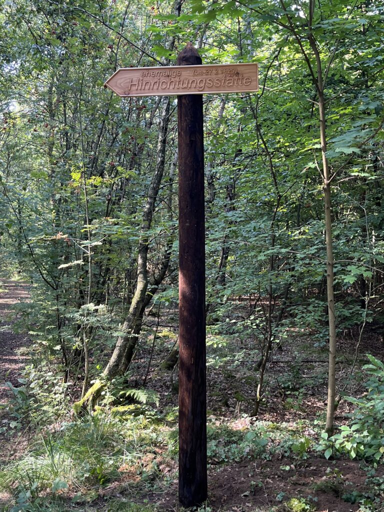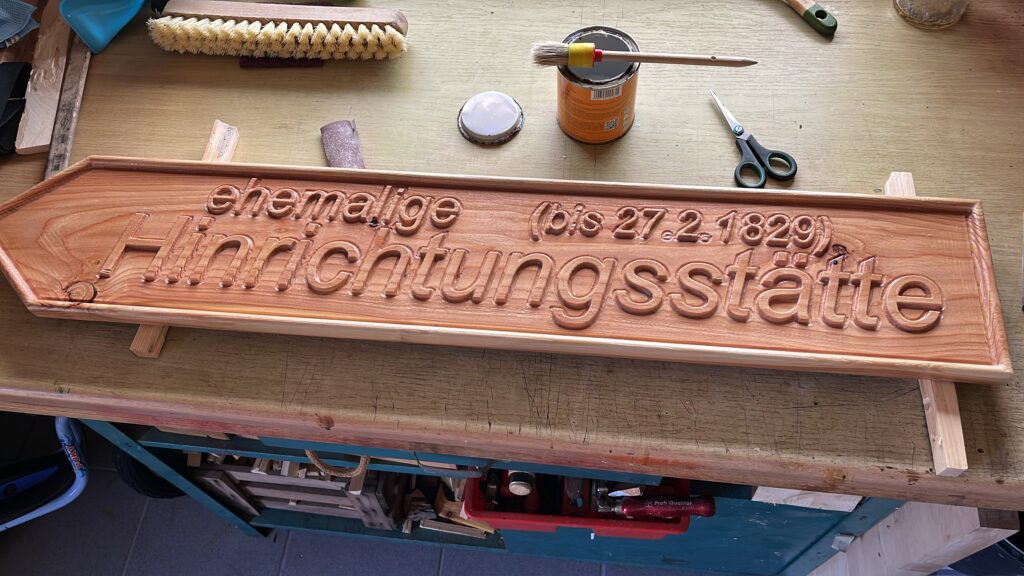 Zurück im Wald wurde an optimaler Position ein Loch gebohrt und der Pfahl eingesetzt. Er trägt jetzt ein neues Schild, das Joachim aus einer Eichenbohle gefräst hat und wird damit viele Jahre lang den Besuchern den richtigen Weg weisen.