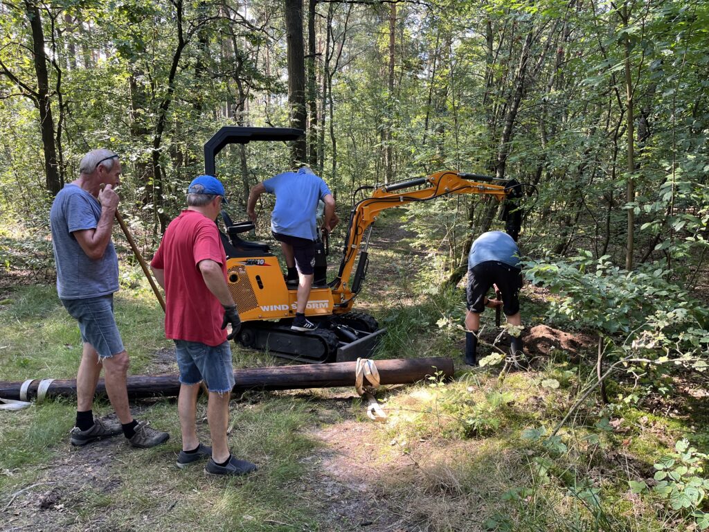 Während eine Gruppe den Findling fachmännisch und schonend reinigte und das Unkraut rings um den Stein beseitigte, zogen die anderen den am Waldpfad befindlichen Pfahl mit dem Hinweisschild aus dem Boden.