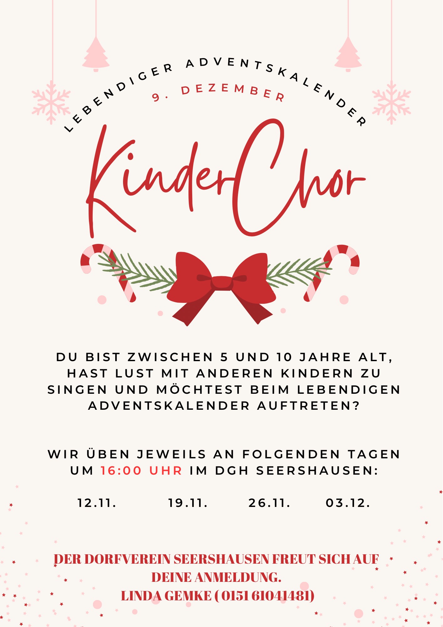 Wir freuen uns, beim „lebendigen Adventskalender“ dabei zu sein und laden alle Kinder herzlich ein, am 09. Dezember vor dem DGH in Seershausen ihren großen Auftritt zu gestalten. Wir treffen uns, an den unten genannten Terminen zur gemeinsamen Probe.