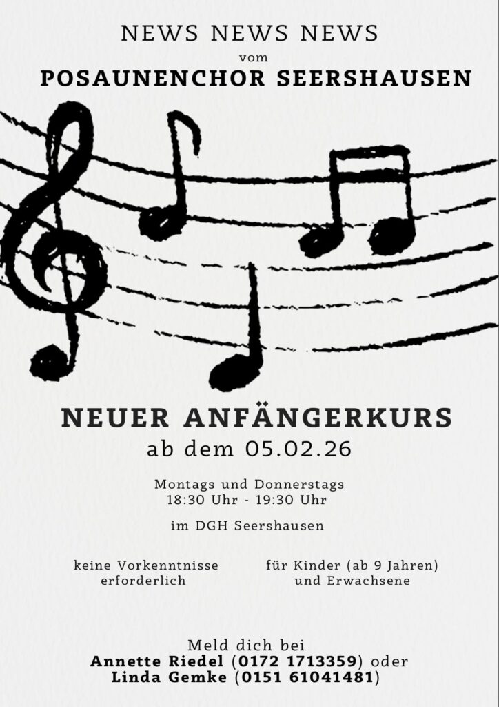 Wenn du Lust hast Trompete, Tenorhorn, Posaune, Tuba oder ein anderes Blechinstrument zu spielen, freuen wir uns, dich im Posaunenchor Seershausen zu begrüßen. Melde dich gerne bei unserer Chorleiterin Annette Riedel.
