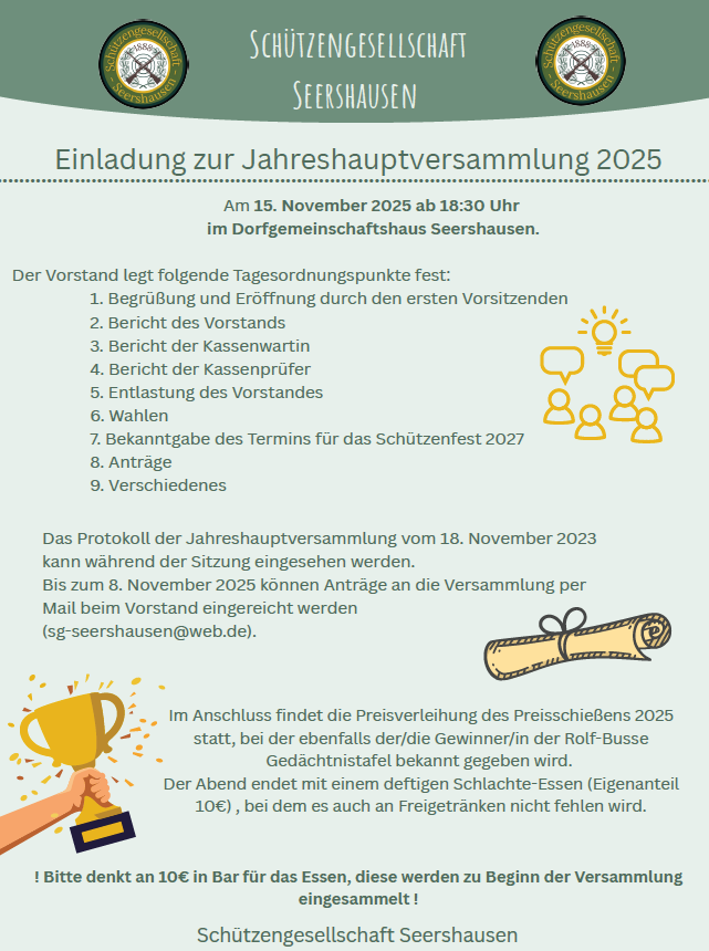 Am Samstag den 29.11. ist es wieder soweit! Die Kerzen Leuchten am Baum, der Glühwein dampft im Becher und die leckeren Würste liegen auf dem Grill. Zur Einstimmung auf die Adventszeit lädt der Anglersportverein Seershausen mit Unterstützung der Freiwilligen Feuerwehr und dem Dorfverein am Samstag, den 29. November 2025 ab 17:30 unter den Eichen zwischen... |